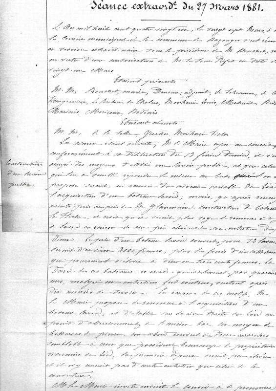 Deux solutions sont proposées lors de la réunion du Conseil Municipal du 27 mars 1881 :