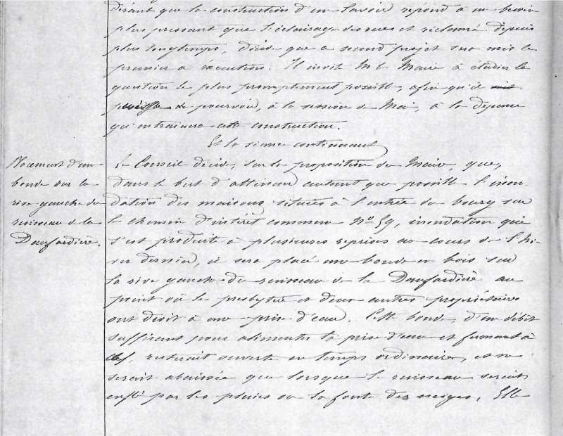 | Le maire propose de renoncer à cette acquisition et d’établir, sur la rive droite, au point d’atterrissage de l’ancien bac, un lavoir au moyen de batteries de pieux, un abord couvert à deux marches, semblables à ceux de propriétaires riverains du Loir. La dépense serait peu élevée, et il n’y aurait pas d’autre entretien que la couverture. | |