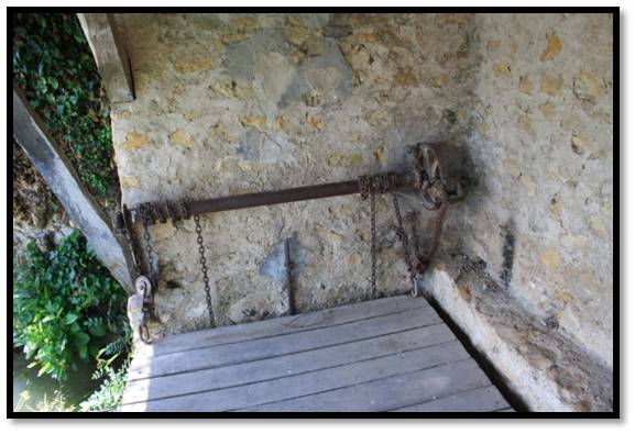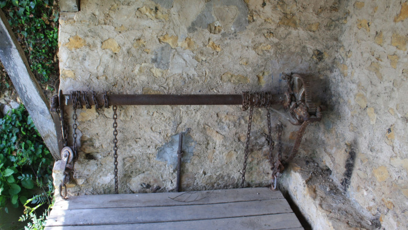 L’intérieur est constitué d’un plancher en bois suspendu par des chaînes qui permettent de le descendre ou de le remonter par un treuil manuel pour s’adapter en permanence au niveau de la rivière. |