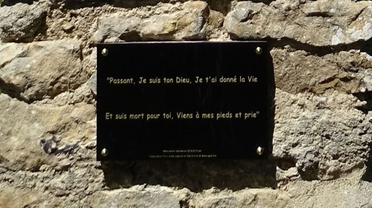 La Croix penche sérieusement vers la route ; la pierre est couverte de mousse, lichens et lierres ; les inscriptions sont quasiment illisibles.