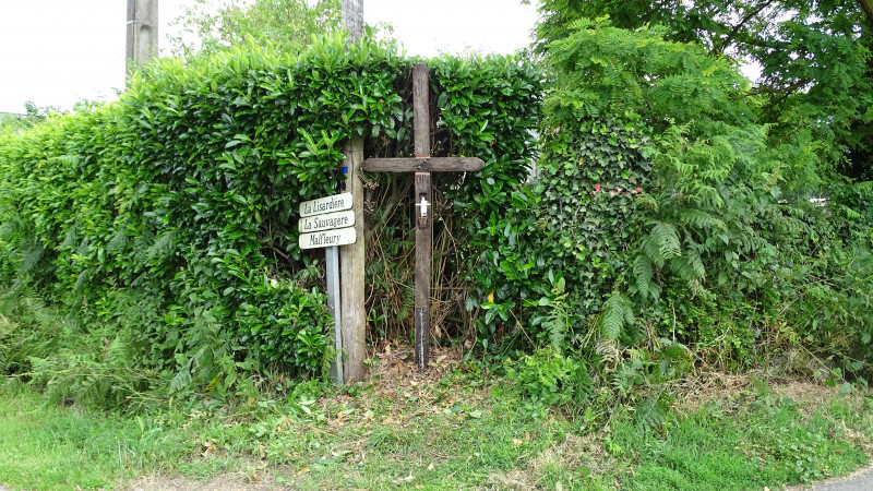 La Croix est construite en bois et comporte une petite niche pour une statue de la Vierge. Elle est complètement enfouie dans la végétation et le bois est relativement abîmé.