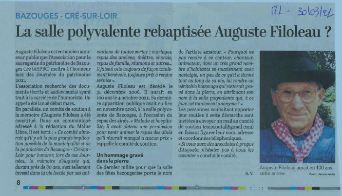Elles seront centrées sur un hommage à Auguste Filoleau, un enfant du village, qui aurait eu 100 ans en 2021.